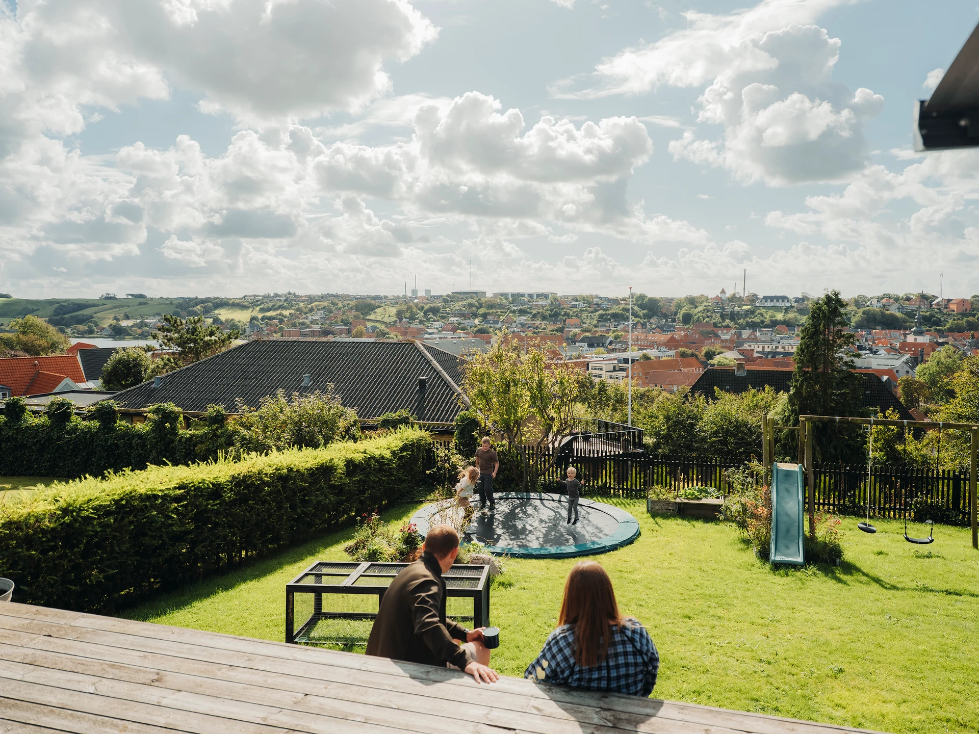 Hun sidder sammen med Alex ved familiens store spisebord i det lyse, moderne køkkenalrum, hvor næsten hele den ene væg består af et kæmpe vinduesparti. Her breder udsigten sig over byens tage og byder også på et kig over til søen.